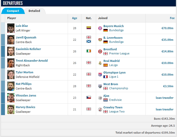 莫顿以1000万欧加500万欧浮动的转会费加盟里昂,利物浦还有球员20%二转分红。加上迪亚斯、宽萨等东说念主,利物浦今夏出售球员收入已达1.433亿欧。此外,努涅斯、基耶萨、埃利奥罕见东说念主也可能今夏离队。