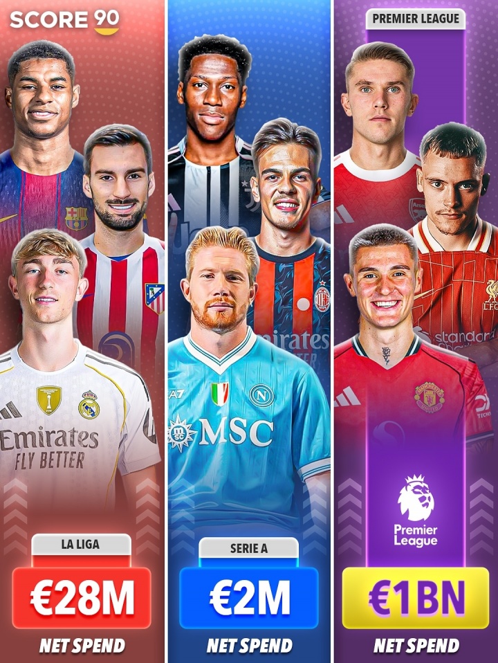 08月12日讯 外媒SCORE90统计了欧洲四大联赛在夏令转会窗的进出情况,英超以10亿欧元的净支拨遥遥跳动,西甲净支拨2800万欧元,意甲200万欧元,德甲则在转会阛阓上净赚1.4亿欧元。