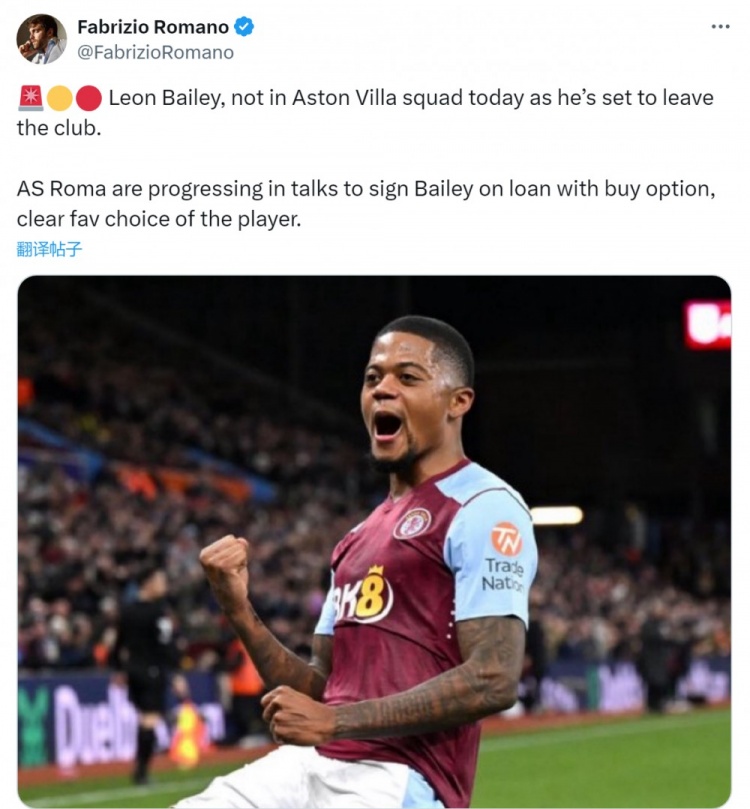 罗马诺指出,利昂-贝利未入选维拉英超首轮的名单,因为他行将离队。罗马正在鼓吹租赁利昂-贝利的接洽,公约中将包含选拔买断条件。罗马是利昂-贝利明确的首选下家。
