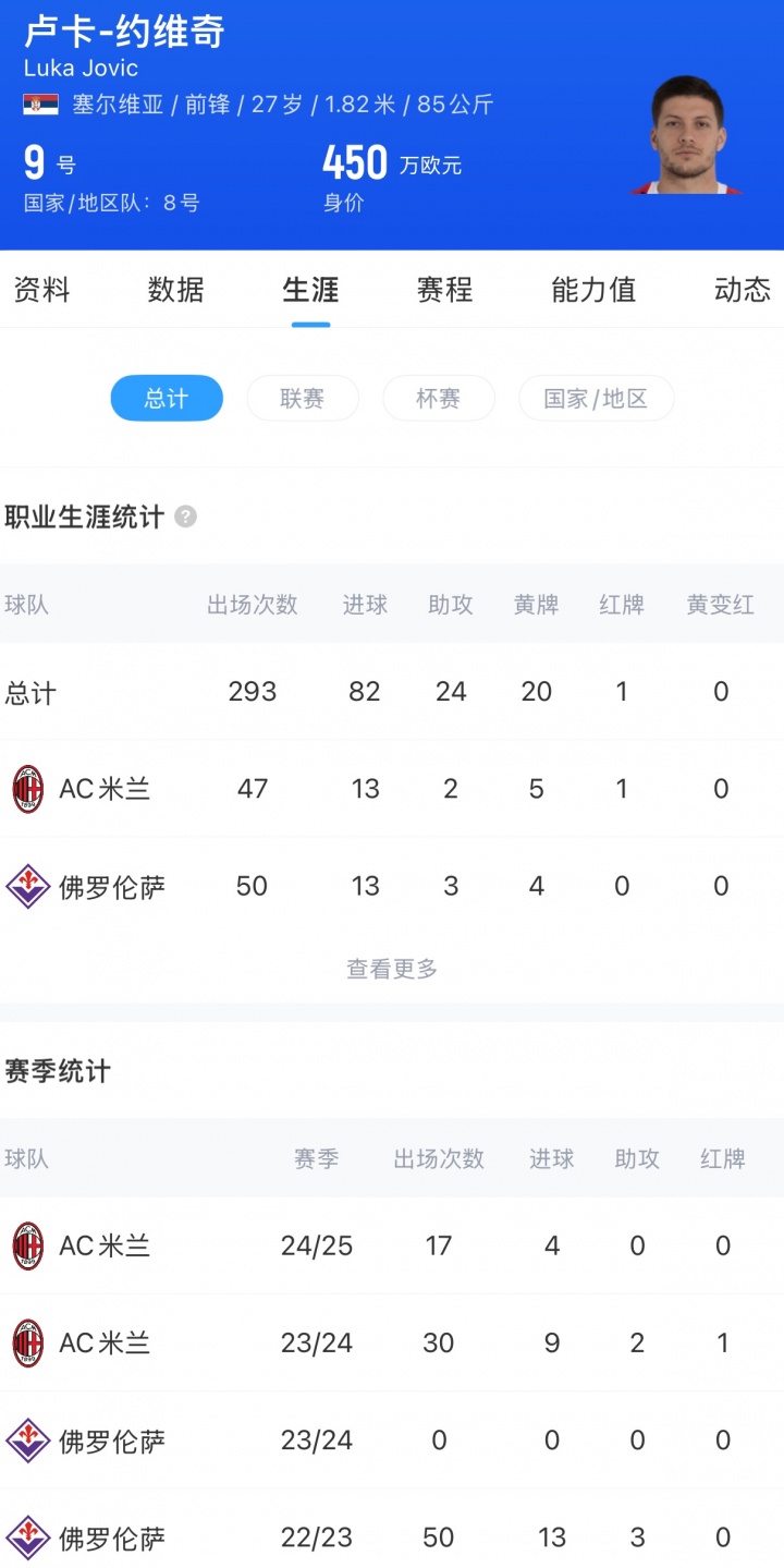 约维奇本年27岁,他于2023年9月加盟AC米兰,并在本年7月成为解放球员。约维奇此前曾为法兰克福着力,并在2019年7月以高达6300万欧元的身价转会皇马,但只是过了两年就被租回法兰克福,况且于2022年解放转会加盟佛罗伦萨。办事活命当今出场293次,打进82球助攻24次。