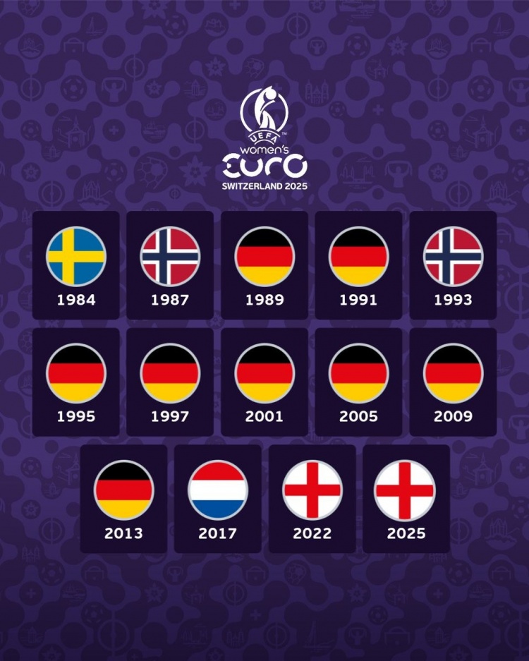 7月29日讯 英格兰女足在本届欧洲杯决赛点杀西班牙女足,兑现了卫冕豪举。而女足欧洲杯官方也盘货了往届冠军,14届比赛德国有8次捧杯。