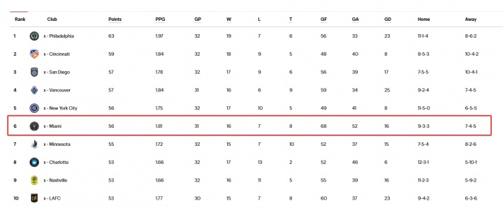 当今好意思职联东西区的通例赛总排行上,费城联32轮63分第一,迈阿密海外31轮56分排在第六。