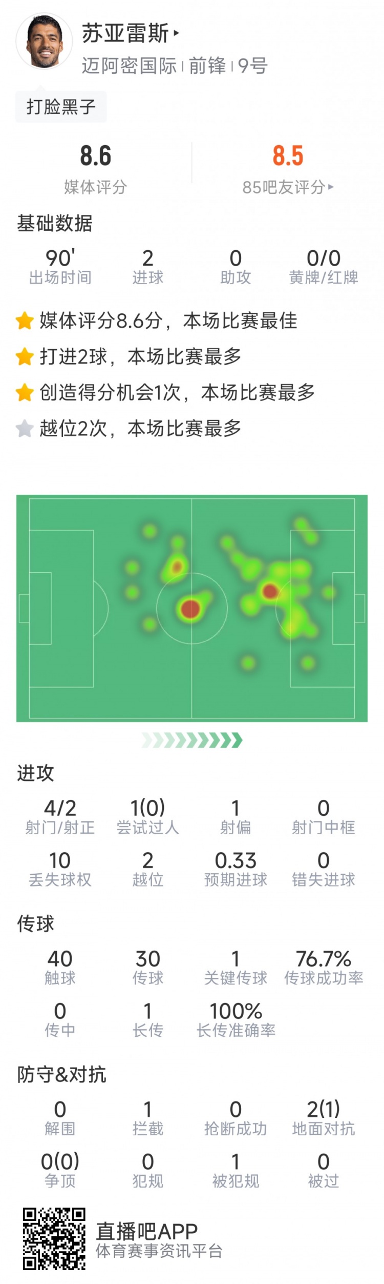 10月1日讯 在本轮好意思职联,迈阿密海外3-5不敌芝加哥火焰。本场比赛苏亚雷斯梅开二度,以下为他在本场数据: