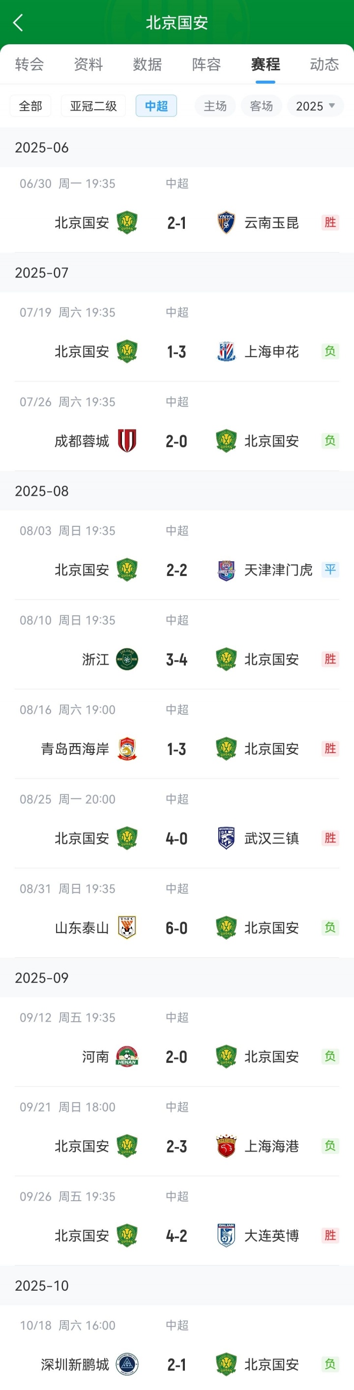 参预联赛下半程,国何在仍是进行的12场比赛中战绩5胜1平6负,输球场次占据了一半,先后不敌申花、蓉城、泰山、河南、海港、新鹏城。10月5日,国安主帅塞蒂恩下课,如今临时主帅拉米罗也未能带队转圜劣势。