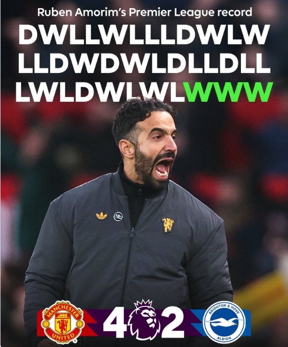 阿莫林抓教曼联的前33场英超比赛从未获得过连胜,如今红魔获得3连胜,展示出了风雅的复苏势头。