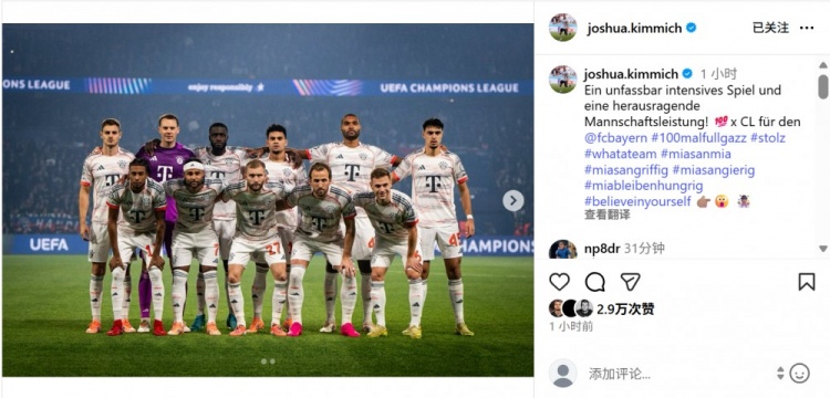 本场比赛亦然基米希生存第100次在欧冠出场,他在个东说念主社媒晒出全队合照,配文写说念:“在这一场病笃历害的比赛中,球队默契完满,竣事欧冠百场里程碑!”