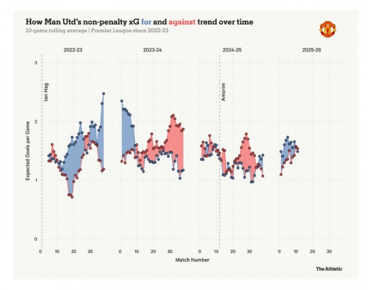 如下图表所示,曼联预期进球数据正稳步高潮。虽距滕哈赫首季巅峰尚有差距,但历久赤字后已显现厚实蓝线,这也促成了帅位更替。