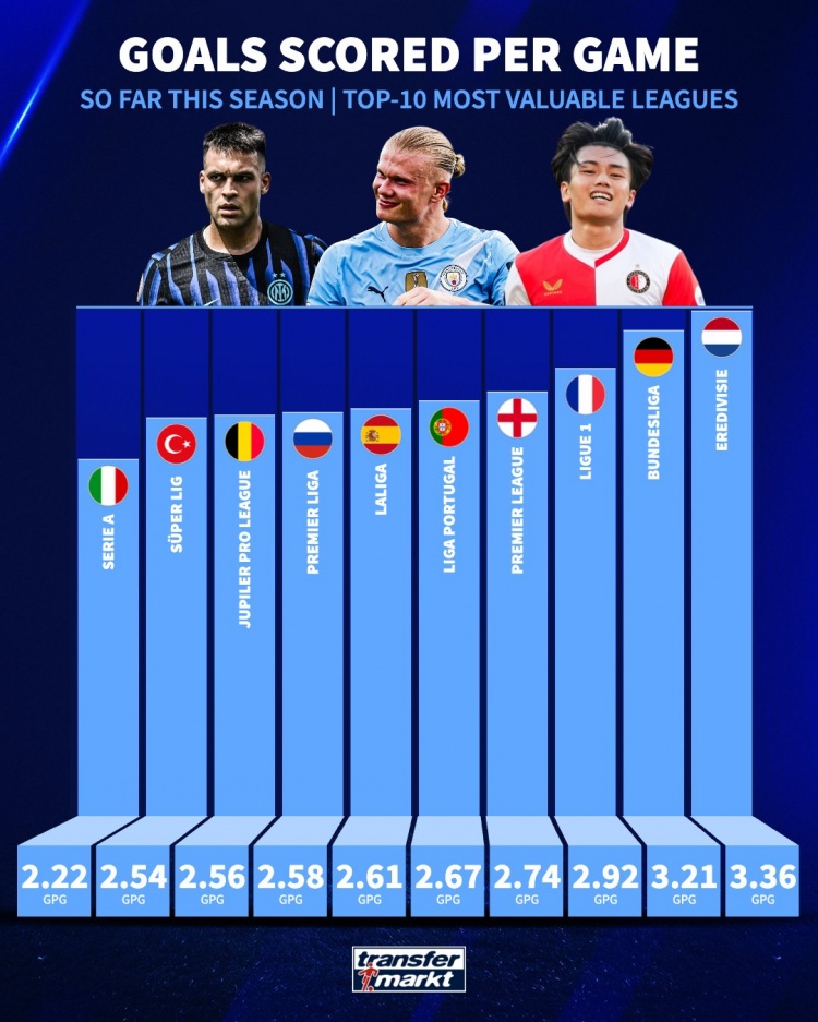 11月20日讯 德国转会阛阓统计了欧洲总身价前10联赛的场均进球数目,比肩出榜单,荷甲3.36球居首,德甲、法甲二三位、意甲2.22球垫底。