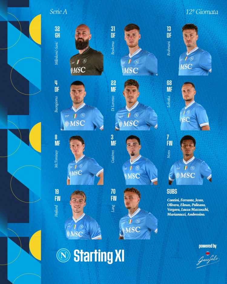 那不勒斯首发:32-瓦尼亚·米林科维奇、31-别克马、13-拉赫马尼、4-布翁乔尔诺、22-迪洛伦佐、68-洛博特卡、8-麦克托米奈、3-米格尔·古铁雷斯、7-内雷斯、19-霍伊伦、70-诺阿·朗