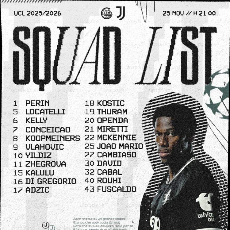 11月24日讯 北京时辰11月26日本周三凌晨4点,欧冠联赛阶段第5轮,尤文客战博德精明,尤文公布了此役大名单。