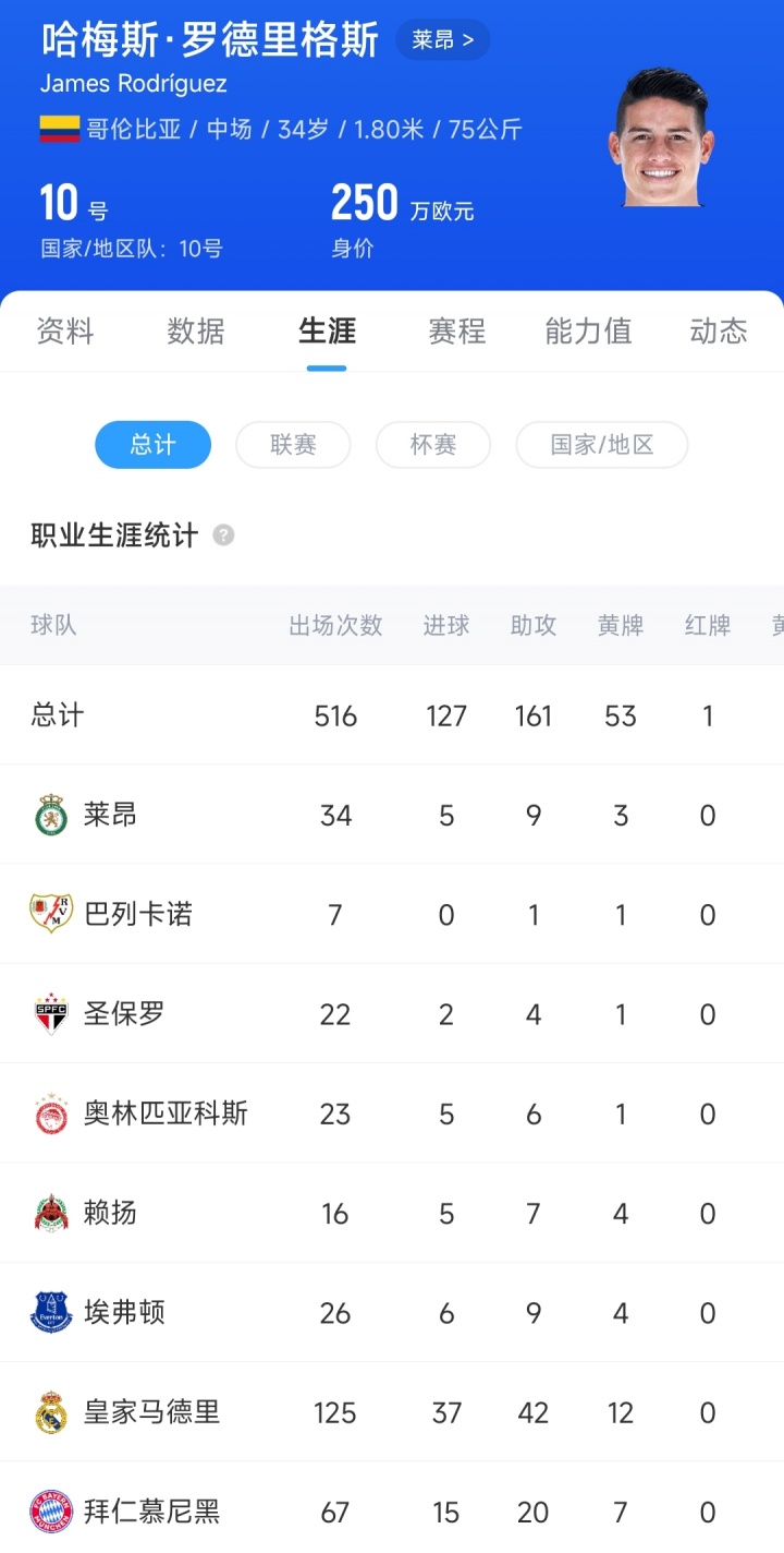 自2020年起,J罗如故迂回过皇马、埃弗顿、赖扬、奥林匹亚科斯、圣保罗、巴列卡诺、莱昂7支球队。加盟莱昂后J罗共出战34场比赛,孝敬5粒进球和9次助攻。当今34岁的J罗德回身价为250万欧元。