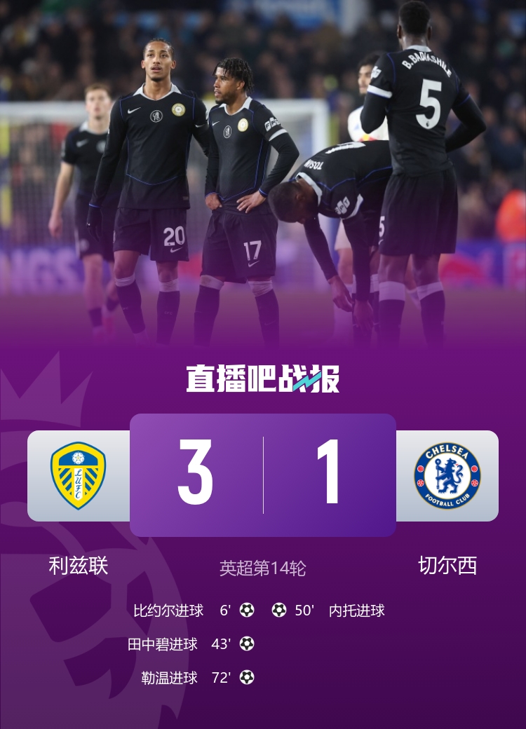 英超第14轮,切尔西客场1-3不敌利兹联,内托进球难救主。