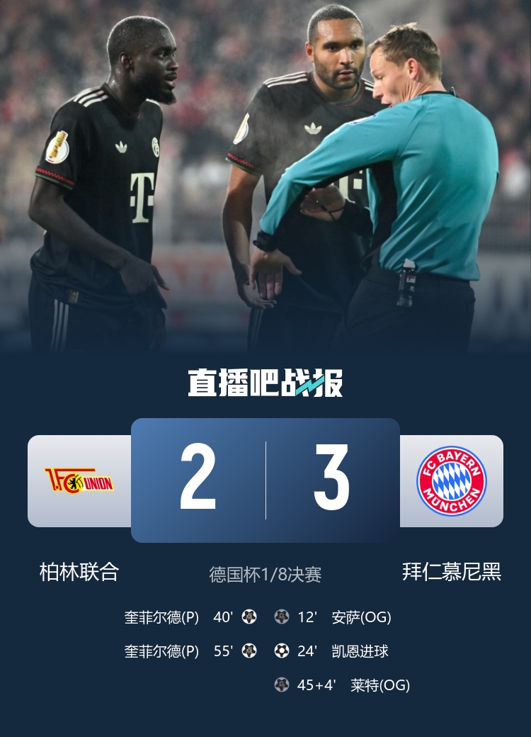 进德国杯八强!拜仁3-2柏林勾通 凯恩破门+送点柏林勾通两送乌龙