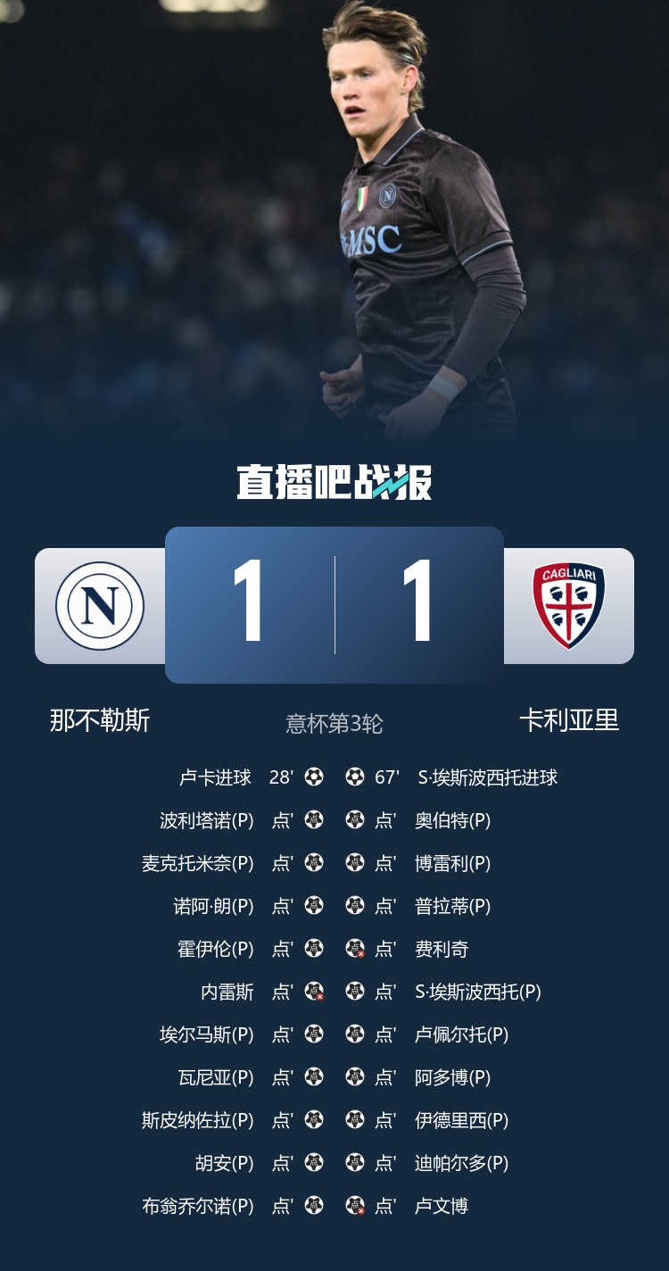 意杯第3轮,那不勒斯点球大战征服卡利亚里,晋级8强。