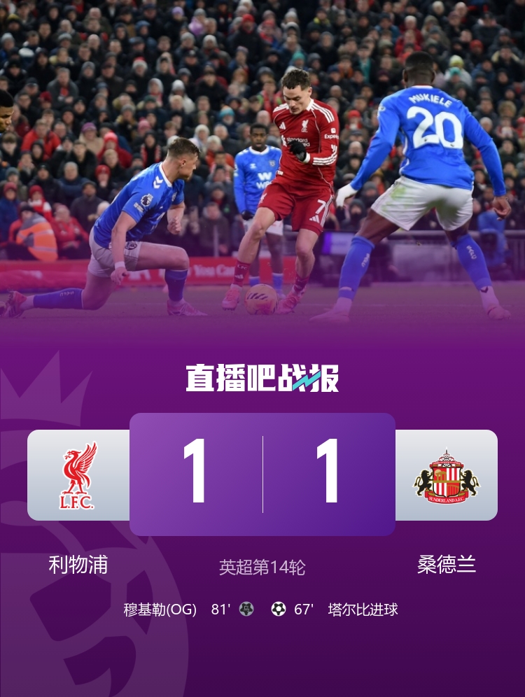 英超联赛第14轮,利物浦1-1桑德兰,维尔茨造乌龙,范戴克造作。