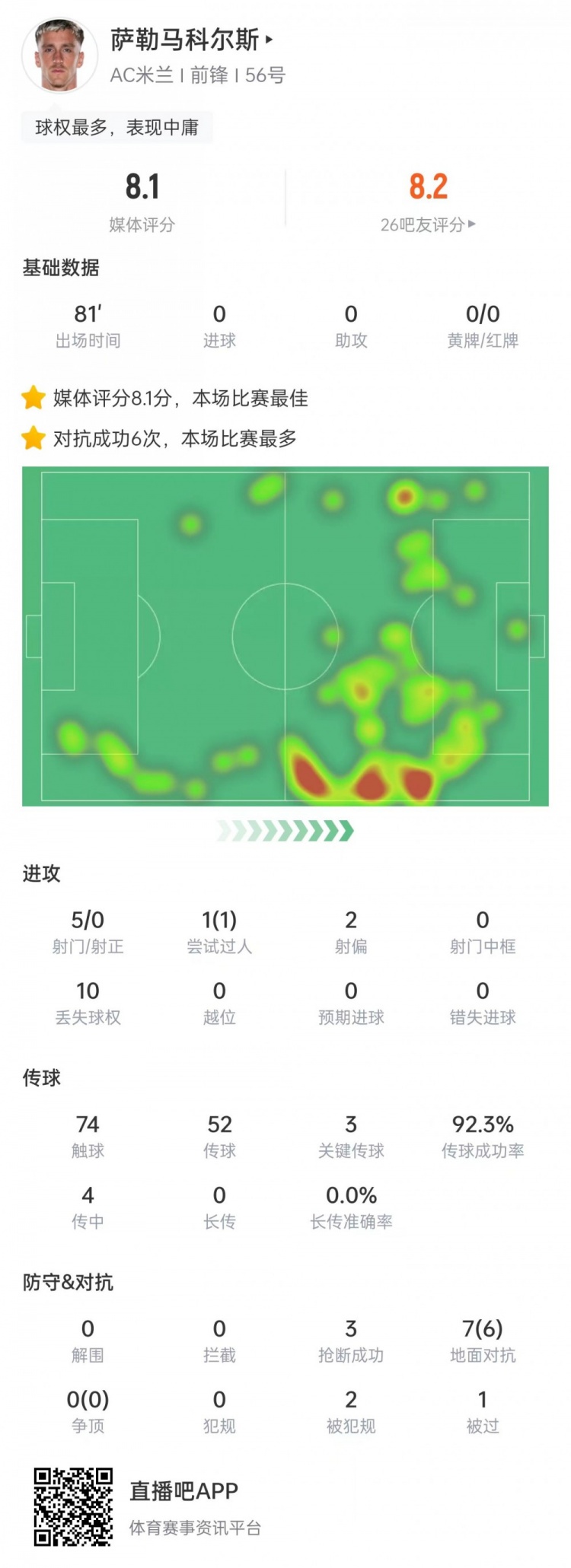 此役萨勒马科尔斯首发出战,送出3记要津传球,匡助米兰取胜,米兰官方晓谕,他当选本场比赛队内最好球员。