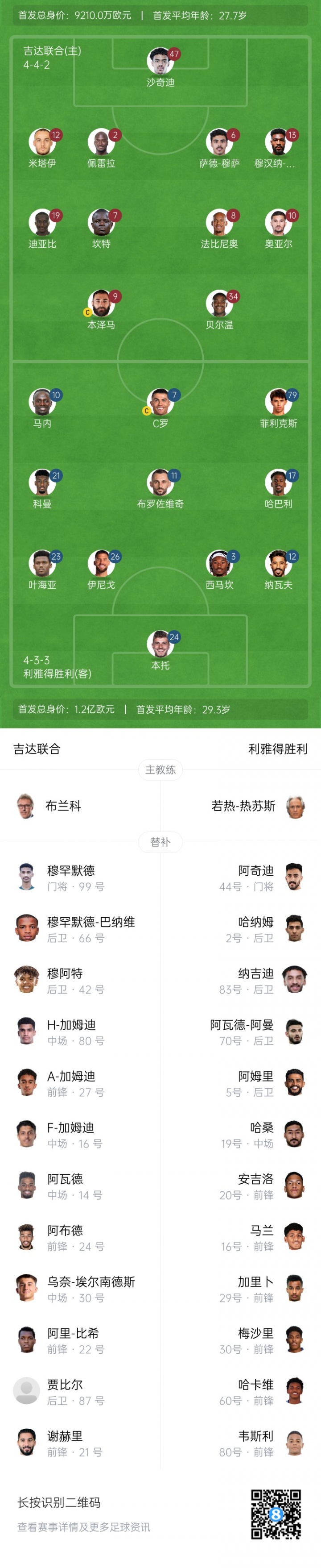 吉达集合首发:47-沙奇迪、12-米塔伊、2-佩雷拉、6-穆萨、13-尚基提、8-法比尼奥、7-坎特、10-奥亚尔、19-迪亚比、9-本泽马、34-贝尔温