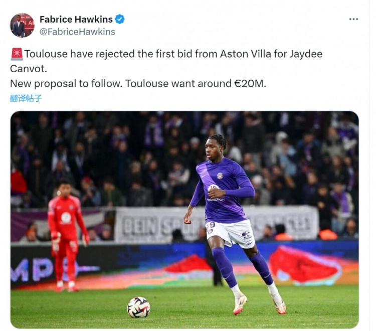 8月19日讯 据记者Fabrice Hawkins报谈,维拉报价图卢兹中卫坎沃遭拒。