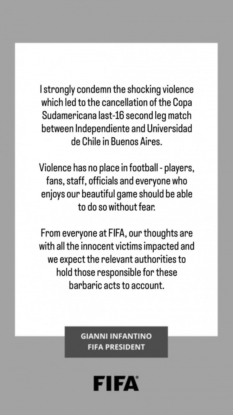 海外足联主席因凡蒂诺社媒非难暴力动作,他写谈:“我强烈非难导致阿根廷落寞队与智利大学队在南好意思杯16强次回合比赛取消的令东谈主恐慌的暴力事件。
