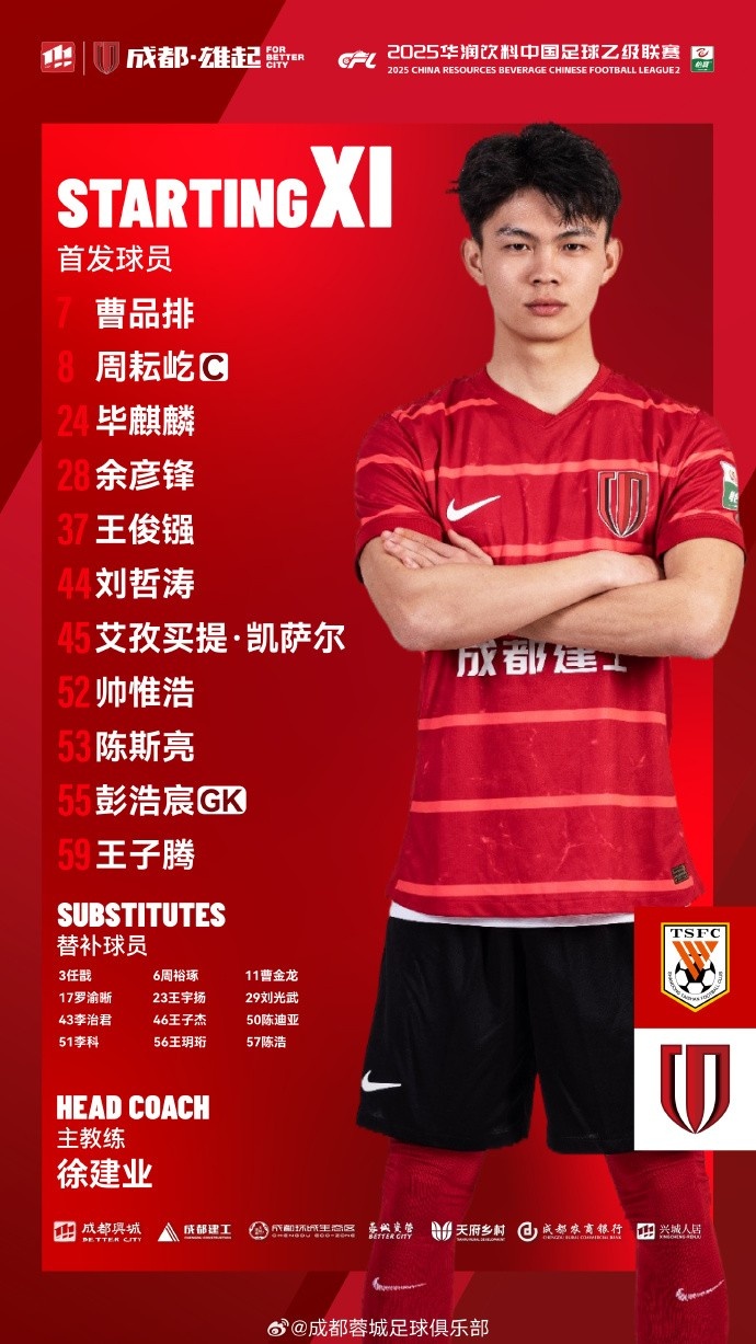 中乙冲甲组第23轮对阵山东泰山B队,成皆蓉城B队首发出炉!