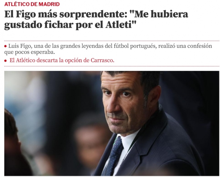 08月27日讯 据《寰宇体育报》报说念,葡萄牙名宿菲戈近日在干涉活动时摄取了采访,并直露:除了奇迹糊口曾效能的巴萨、皇马以外,他还曾有加盟马竞的思法。