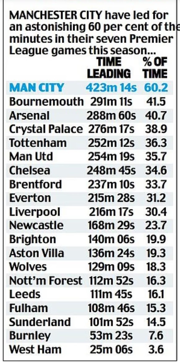 尽管现在在积分榜上只可位居第5,但曼城的向上时分达到了423分钟14秒,占总比赛时分的60.2%,伯恩茅斯、阿森纳和水晶宫是前四中的另外三支球队。曼联现在在积分榜上位居第10位,但他们在比赛中的向上时分不错在20支球队中位居第5。