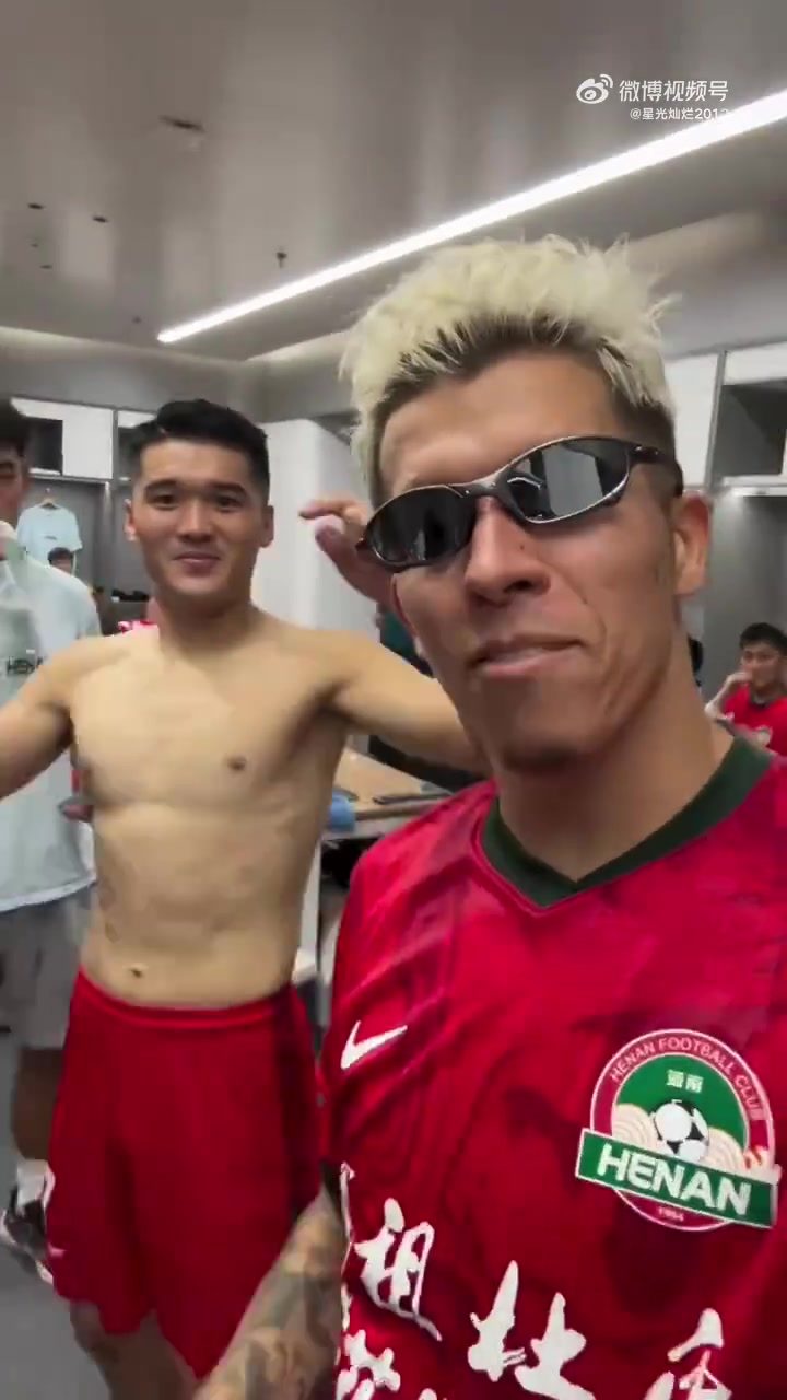 视频中,河南队外助纳萨里奥戴着墨镜领舞,全队在更衣室又唱又跳庆祝获胜。