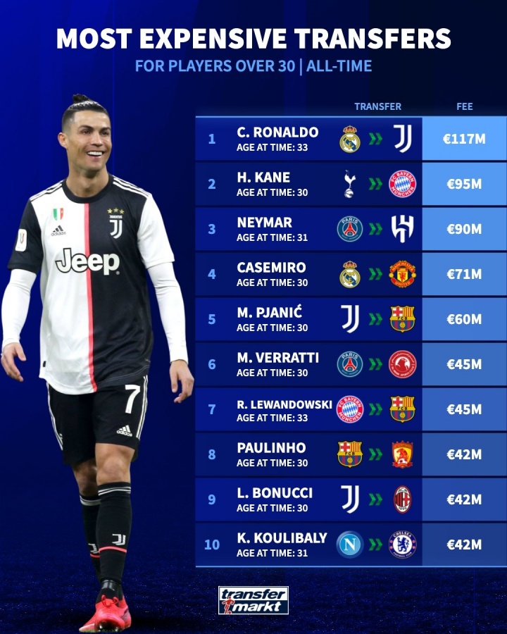 10月29日讯 德转盘货了足坛历史30岁及以上球员转会费记录榜,其中C罗33岁加盟尤文以1.17亿欧居首,凯恩加盟拜仁次席,内马尔9000万欧第三。