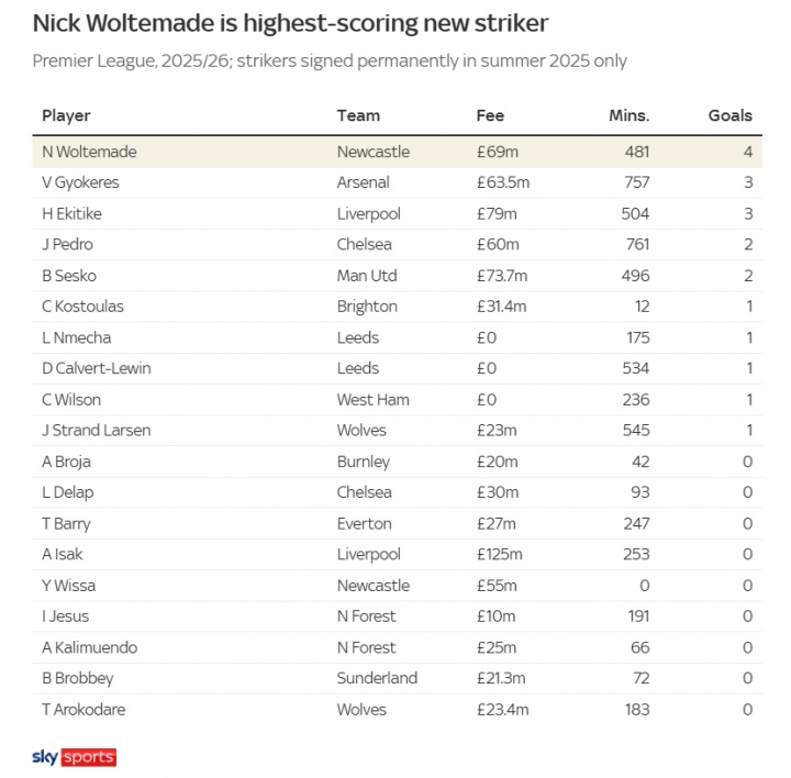其中纽卡标王先锋沃尔特马德以4粒进球暂时领跑这份榜单,阿森纳的约克雷斯以及利物浦的埃基蒂克均打进3球,切尔西的若昂-佩德罗以及曼联的舍什科别离打进2球,今夏转会标王伊萨克暂未大开进球账户。