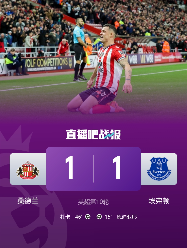恩迪亚耶破门首开记载,扎卡抽射破门扳平比分,基恩禁区手球未判罚,最终桑德兰1-1埃弗顿升第4。
