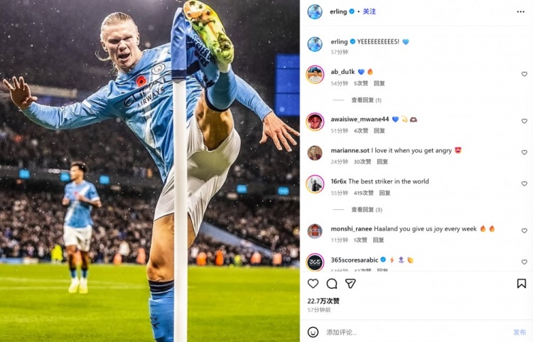 11月10日讯 曼城在本轮英超焦点战主场3-0完得手物浦,哈兰德在失点后面槌破门。