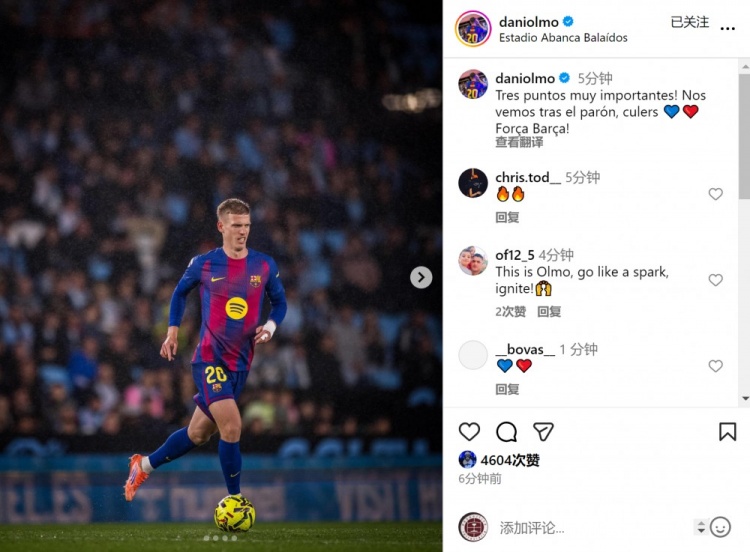 奥尔莫社媒晒出比赛像片,配文:“绝顶紧迫的三分,巴萨球迷们,我们休赛期之后见,加油巴萨!”