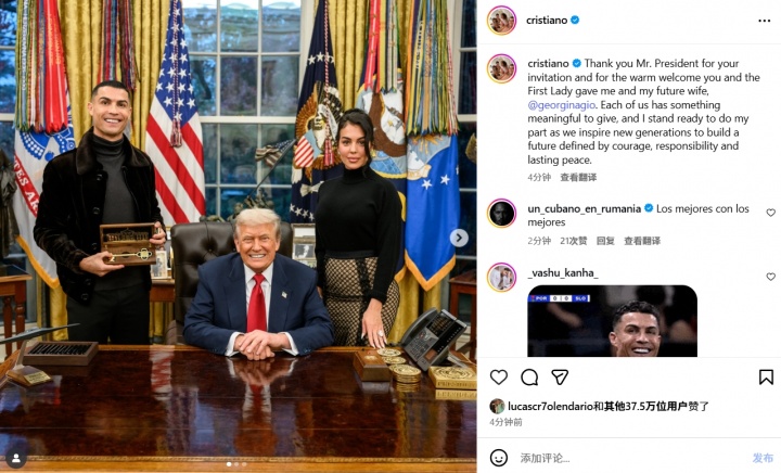 11月20日讯 C罗近日获邀赶赴白宫,出席了白宫为沙特王储举行的一场晚宴。C罗在社媒发表动态感谢好意思国总统特朗普的邀请。