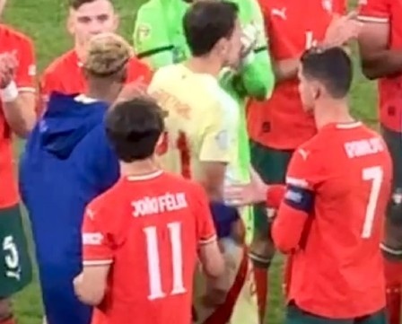 C罗赛后主动伸手和亚马尔持手,后者将脸侧向一旁