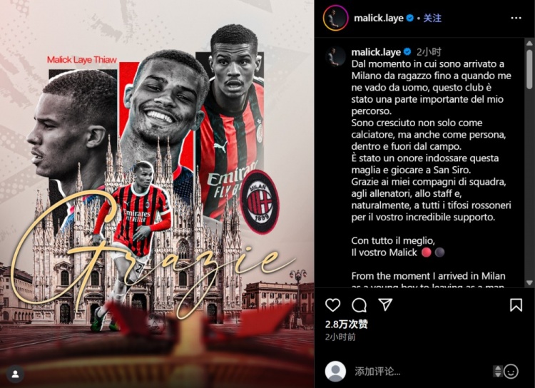 8月14日讯 夏窗佳夫从米兰转会纽卡,往复仍是官宣。这名后卫在个东说念主社媒发文,向米兰告别。