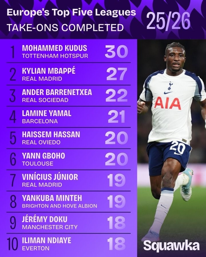 10月17日讯 左证本赛季欧洲五大联赛的数据统计,热刺球员库杜斯以30次见效过东说念主领跑该项数据榜,皇马时尚姆巴佩以27次紧随后来。