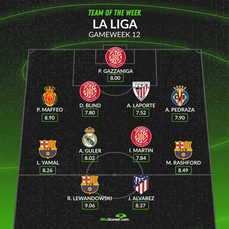 11月10日讯 WhoScored列出了西甲第12轮最好威望,莱万、拉什福德、亚马尔、阿尔瓦雷斯、居莱尔在列。
