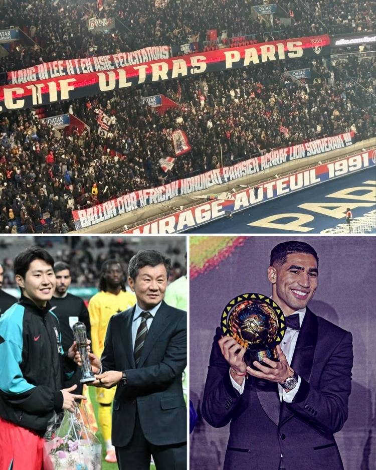 巴黎球迷此役拉出横幅,祝愿李刚仁(亚足联最好外洋球员)和阿什拉夫(非洲足球先生)获奖。