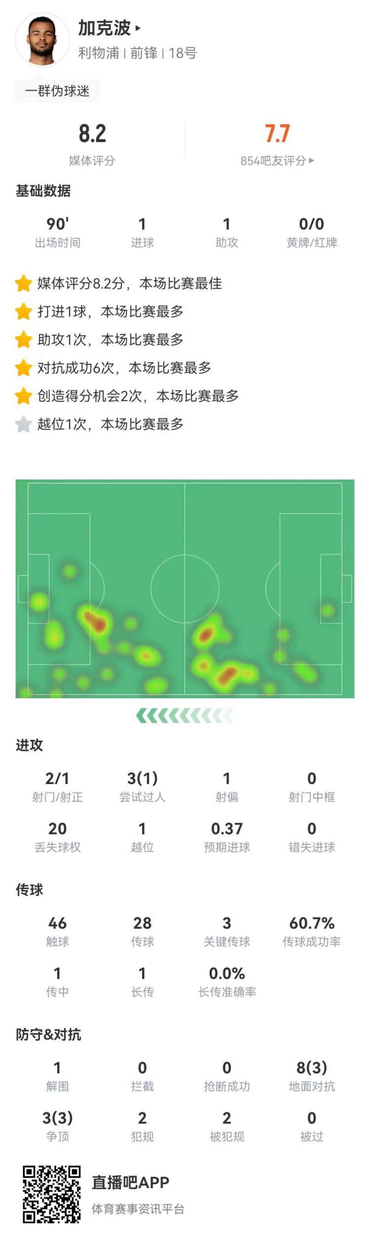 11月30日讯 利物浦在本轮英超对阵西汉姆,加克波本场数据如下: