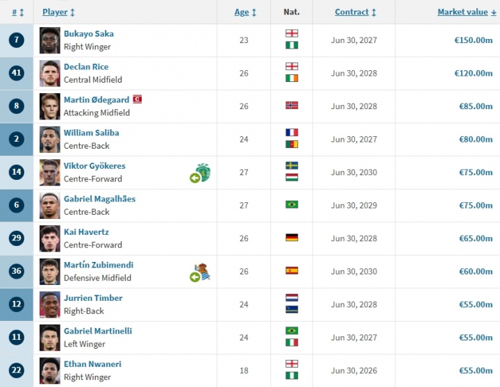 阿森纳队内身价排行(单元:欧元/数据着手德转):