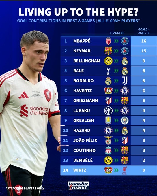 该榜单具体名次如下↓(只统计转会费>1亿欧元的过错手,数据为进球+助攻)
