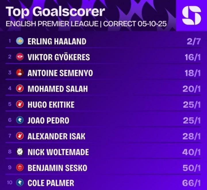 10月6日讯 英超第7轮比赛,曼城以1-0的比分小胜布伦特福德,哈兰德打进全场惟一进球。本场比赛之后,挪威弓手以9球位居弓手榜首位,跨越次席的塞梅尼奥3球。