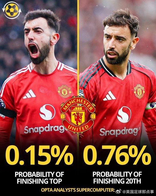左证Opta超算瞻望,本赛季曼联在英超排在第20名的概率居然比夺冠还高🤯