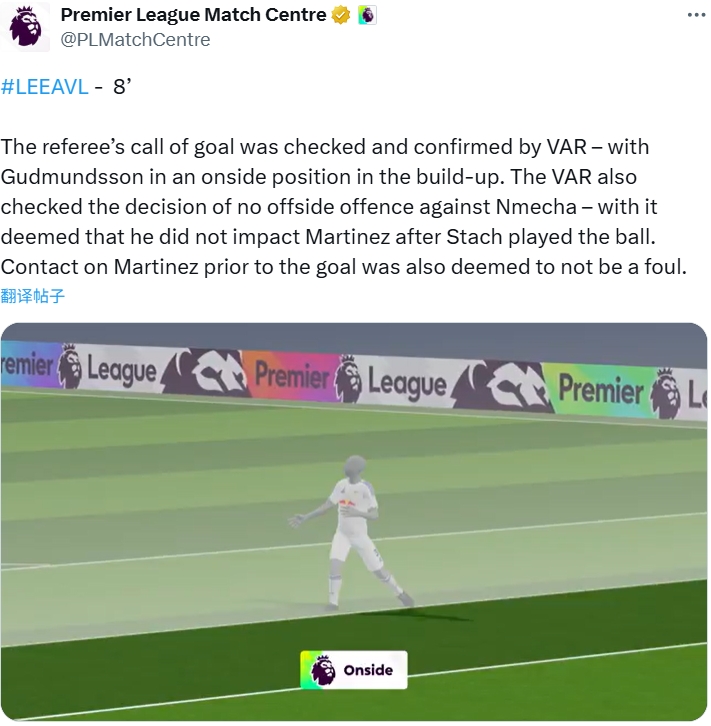 利兹联vs阿斯顿维拉第8分钟,主裁判判罚进球灵验,VAR回放并说明:古德蒙德森处于不越位的位置,VAR同期复核了对恩梅查未判越位的决定,认定斯塔赫触球后,恩梅查并未影响马丁内斯。同期进球前对马丁内斯的斗争亦被判定不组成犯规。