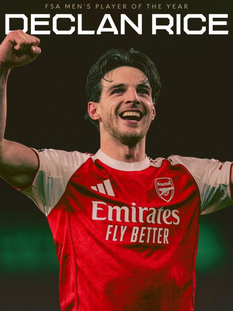 赖斯获颁英格兰和威尔士球迷组织FSA年度最好男足球员奖,阿森纳官方社媒晒出海报,配文:“经由全英国球迷的投票,赖斯当选FSA年度最好男足球员,实至名归。”