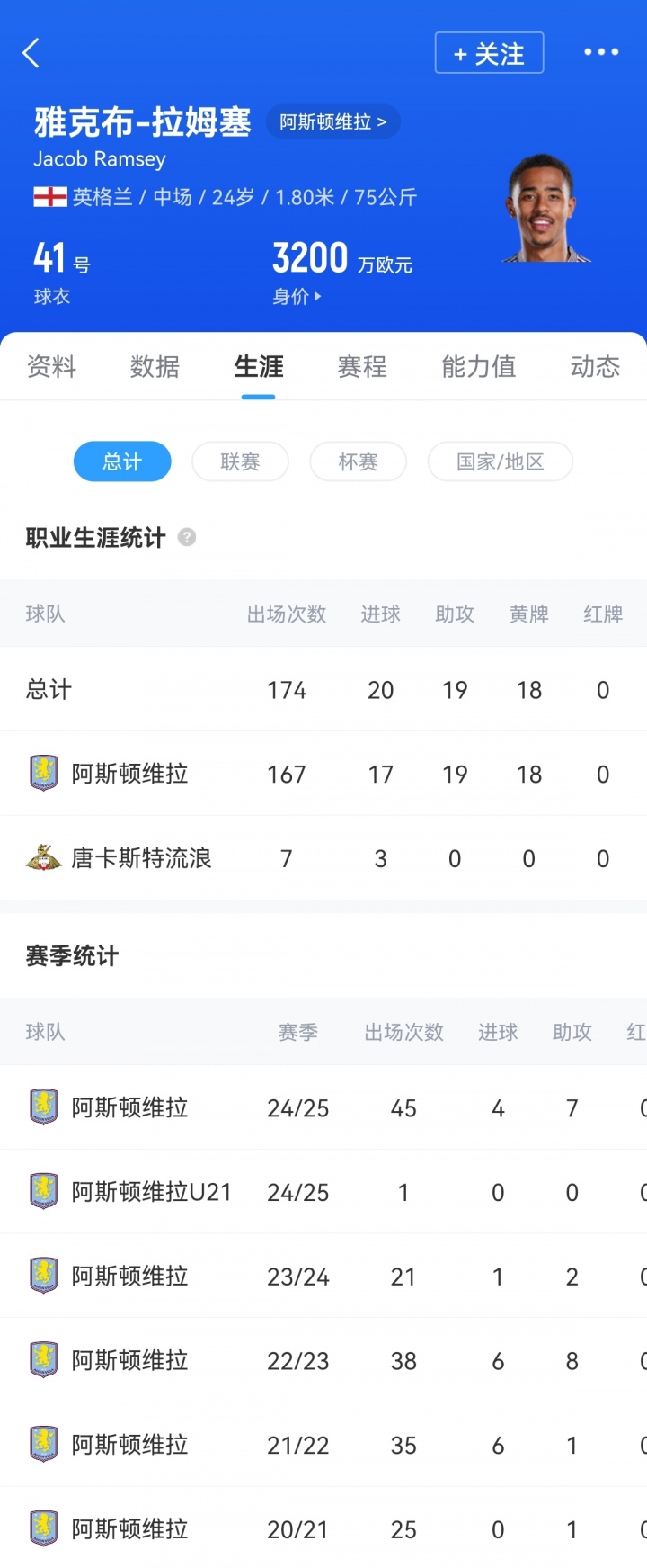 拉姆塞是维拉青训配置的球员,6岁就加入维拉青训学院,2019年与维拉签署处事条约。杀青现在,拉姆塞为维拉出战137次打入14球,他的德回身价是3200万欧元。