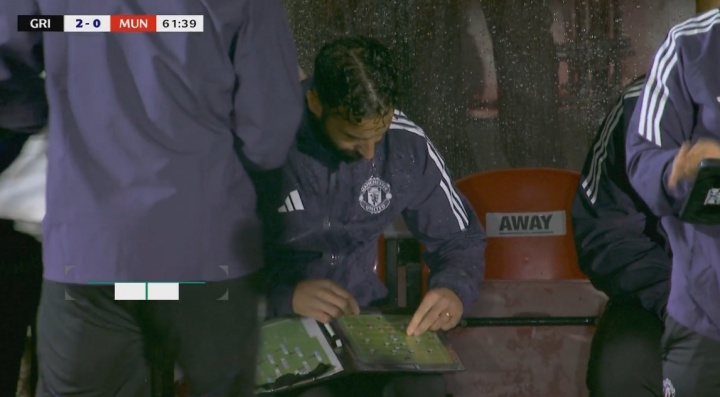 08月28日讯 联赛杯曼联vs格林斯比,第62分钟镜头给到场边,阿莫林在场边拿着计谋板。