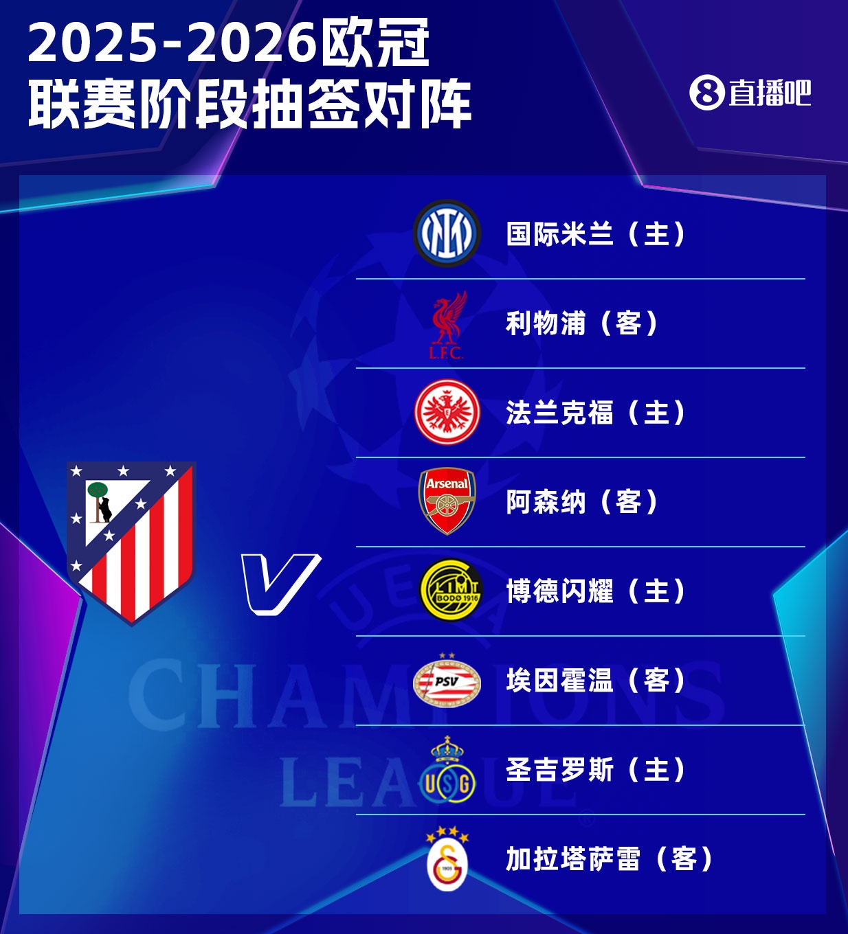 8月30日讯 欧足联公布了欧冠联赛阶段的留神赛程,每支球队将分离进行4场主场和4场客场比赛,以下为马竞具体赛程(北京工夫):