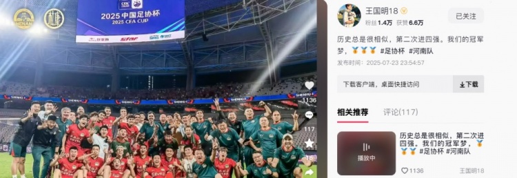 7月24日讯 足协杯1/4决赛,河南队客场通过点球大战淘汰上海申花,晋级四强。赛后,河南队门将王国明更新个东谈主酬酢媒体,庆祝成效。