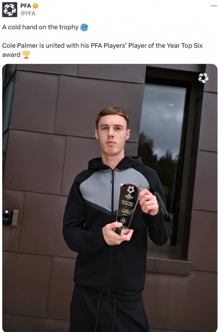 10月7日讯 帕尔默此前荣膺PFA(英格兰奇迹球职工会)年度最好球员前6名,PFA官推也晒出帕尔默领取奖杯的像片。